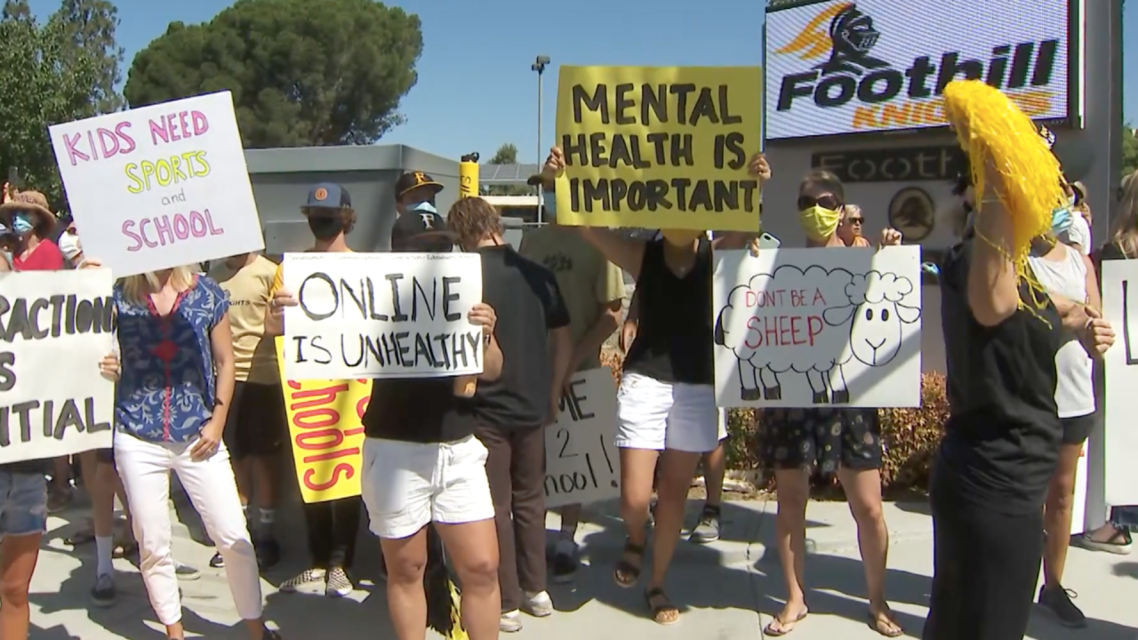 গভর্নর গেভিন নিউসাম বলেছেন দক্ষিণ ক্যালিফোর্নিয়ার বেশিরভাগ কাউন্টির স্কুল পুনরায় খোলার অনুমতি দেওয়া হবে না। কিন্তু তার এই ঘোষণার পরের দিন শনিবার সকালে উত্তর টুস্টিনের ফুথিল উচ্চ বিদ্যালয়ের বাইরে কয়েক ডজন শিক্ষার্থী এবং তাদের অভিভাবকরা স্কুলে ক্লাস করা ও খেলাধুলার সুযোগ দেয়ার জন্য সমাবেশ ও স্লোগান দিয়েছেন। তারা করোনা পরিস্থিতি স্বাভাবিক না হলেও জীবন যাত্রা স্বাভাবিক করার দাবি করেন।