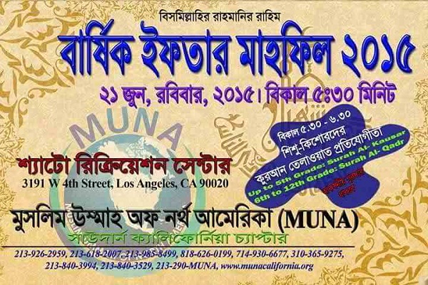 বছর ঘুরে আবার আমাদের কাছে ফিরে এলো পরম রহমতের মাস “মাহে রমজান” । এ উপলক্ষে মুসলিম উম্মাহ অব নর্থ আমেরিকা বা মুনা শিশু কিশোরদের কুরআন তিলাওয়াত প্রতিযোগিতা ও ইফতার মাহফিলের আয়োজন করেছে। মুনা’র সাউদার্ন ক্যালিফোর্নিয়া চ্যাপ্টার এ আয়োজন করেছে।