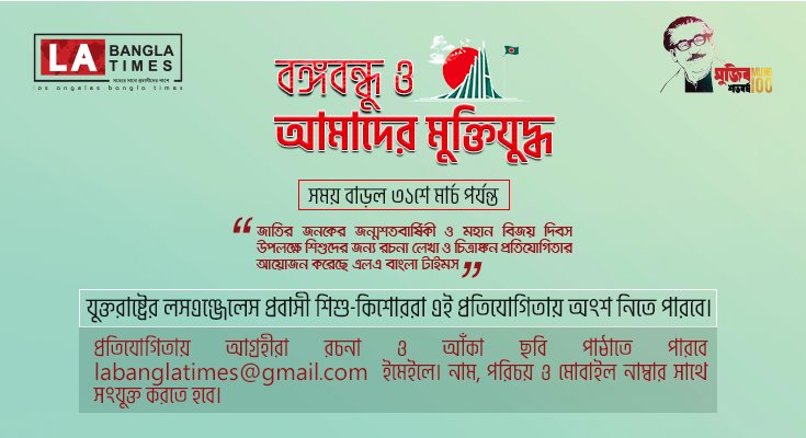 বাংলাদেশের স্বাধীনতার সূবর্ণ জয়ন্তী, ৫০তম বিজয় দিবস ও জাতির পিতা বঙ্গবন্ধু শেখ মুজিবুর রহমানের জন্মশতবার্ষিকী উপলক্ষে শিশু-কিশোরদের অংশগ্রহণে রচনা লেখা ও চিত্রাঙ্কন প্রতিযোগিতার আয়োজন করেছে যুক্তরাষ্ট্রভিত্তিক এলএ বাংলা টাইমস।