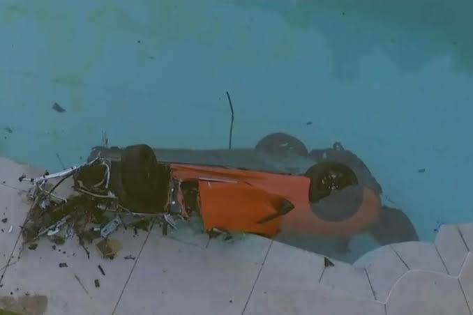 একটি সেন্টার মেডিয়ানের সাথে সংঘর্ষের পর যাত্রী ও চালক ওড়ে গিয়ে অন্য একটি বাড়ির ব্যাক ইয়ার্ডে থাকা সুইমিংপুলে পরে।