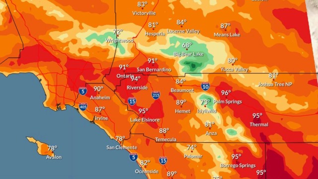 আবহাওয়া পূর্ভাবাসে বলা হয়েছে, বৃহস্পতিবার থেকে শনিবার পর্যন্ত ইনল্যান্ড অঞ্চলে আবহাওয়া বেড়ে হবে ৮০ ডিগ্রী থেকে ৯০ ডিগ্রী ফারেনহাইট। কিছু এলাকায় তাপমাত্রা ৯০ ডিগ্রী ছাড়িয়ে যাবে। যেমন পাম স্প্রিংসে তাপমাত্রা বৃ্হস্পতিবার ৯৭ ডিগ্রী হতে পারে ও শনিবারে ৯৮ ডিগ্রী হতে পারে।