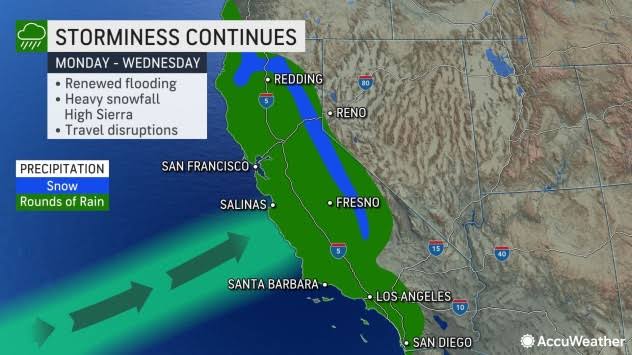 শুক্রবার এবং শনিবার অ্যাটমোস্ফেরিক রিভারের প্রভাবে এই অঞ্চলে বৃষ্টিপাত শুরু হয়েছে। তবে শনিবার বিকাশ নাগাদ মেঘ পূর্ব দিকে সরে যাবে। রবিবার আবহাওয়া শীতল থাকবে তবে এদিন বৃষ্টিপাত হওয়ার সম্ভাবনা নেই।