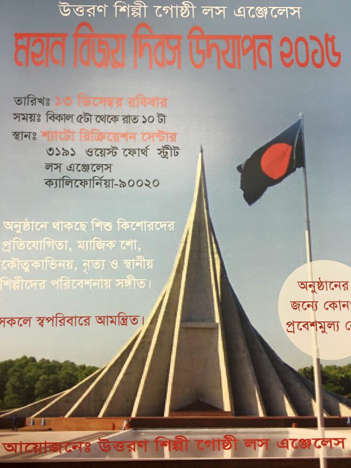 লস এঞ্জেলেসের অন্যতম প্রধান সাংস্কৃতিক সংগঠন উত্তরণ শিল্পী গোষ্ঠী বাংলাদেশের মহান বিজয় দিবস উদযাপন করতে যাচ্ছে। এ উপলক্ষে আগামী ১৩ই ডিসেম্বর ২০১৫ তারিখে উত্তরণ শিল্পী গোষ্ঠী একটি সাংস্কৃতিক অনুষ্ঠানের আয়োজন করেছে। অনুষ্ঠানে থাকছে শিশু কিশোরদের প্রতিযোগিতা , ম্যাজিক শো, কউতুকাভিনয়, নৃত্য ও স্থানীয় জনপ্রিয় শিল্পীদের পরিবেশনায় মনোজ্ঞ সঙ্গীত।
