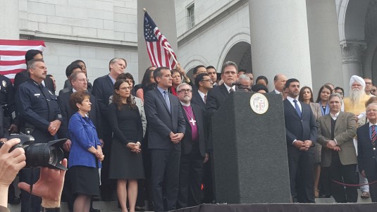 রবিবার লস এঞ্জেলেস সিটিহলের সম্মুখে সিটি মেয়র এরিক গার্সিটির নেতৃত্বে এ সভায় দুই সহস্রাধিক লোক অংশ নেয়।