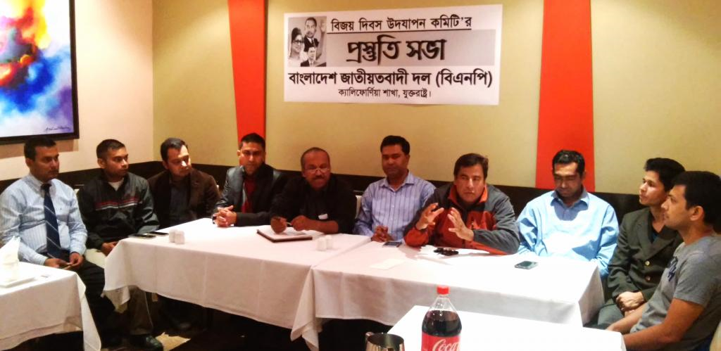আসন্ন 'বিজয় দিবস' উপলক্ষ্যে দলের কর্মসূচি'কে সফল করার উদ্দেশ্যে 'প্রস্তুতিসভা' করেছে ক্যালিফোর্ণিয়া বিএনপি। গত সোমবার, ১৭ই নভেম্বর সন্ধ্যায়, লসএঞ্জেলেসের CardamomLA cuisine -এ সভা অনুষ্ঠিত হয়। এই সভায় সভাপতিত্ব করেন'আয়োজক কমিটি'র আহবায়ক যুবনেতা লায়েক আহমেদ। ক্যালিফোর্ণিয়া বিএনপি'র সভাপতিমোঃ আঃ বাছিত-সহ অন্যান্য কেন্দ্রীয় নেতৃবৃন্দরাও এ সময় উপস্হিত ছিলেন।