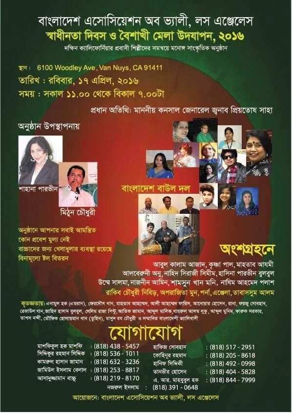 বাংলাদেশের মহান স্বাধীনতা ও বাংলা নববর্ষ উপলক্ষে স্বাধীনতা দিবস, বৈশাখী মেলা ও দক্ষিণ ক্যালিফোর্নিয়ার শিল্পীদের নিয়ে এক মনোজ্ঞ সাংস্কৃতিক অনুষ্ঠানের আয়োজন করেছে বাংলাদেশ এসোসিয়েশন অব ভ্যালি। আগামী ১৭ এপ্রিল রবিবার সকাল ১১টা থেকে বিকাল ৭টা পর্যন্ত 6100 Woodley Ave, Vun Nuys, CA 91411-এ এই অনুষ্ঠানমালা অনুষ্ঠিত হবে।