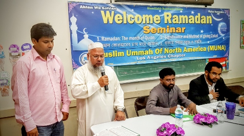 পবিত্র মাহে রমাদান'কে স্বাগত জানিয়ে মুসলিম উম্মাহ অব নর্থ আমেরিকা- লস এঞ্জেলেস চ্যাপ্টারের উদ্যোগে অনুষ্ঠিত হল 'ওয়েলকাম রমাদান' সেমিনার। গত ২৮শে মে শনিবার অপরাহ্নে স্থানীয় শ্যাটো রিক্রিয়েশন সেন্টারে অনুষ্ঠিত হয়। চ্যাপ্টার প্রেসিডেন্ট আশরাফ হোসেন আকবরের সভাপতিত্বে এবং সেক্রেটারি শরিফুল ইসলামের পরিচালনায় উক্ত সেমিনারে প্রধান অতিথি ছিলেন মুনা ওয়েস্টার্ন জোন প্রেসিডেন্ট আনিসুর রহমান। এই সেমিনারে দুটি বিষয়ের উপরে প্রবন্ধ উপস্থাপিত হয়।