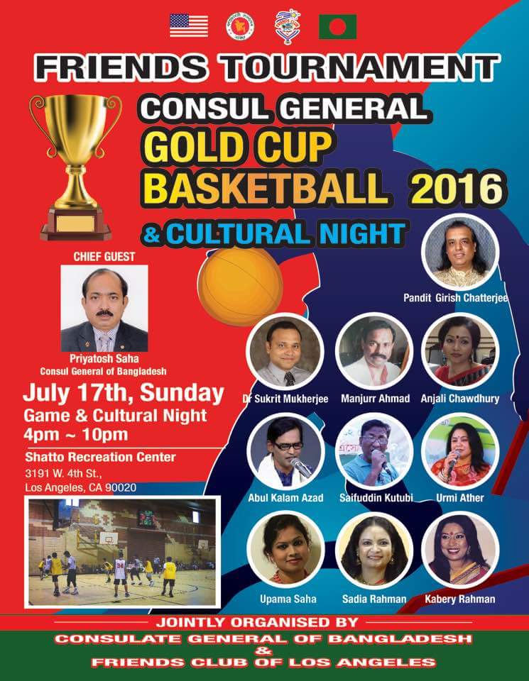 লস এঞ্জেলেসে কনস্যুলেট জেনারেল অব বাংলাদেশ ও ফ্রেন্ডস ক্লাব অব লস এঞ্জেলেস-এর যৌথ উদ্যোগে এক বাস্কেটবল প্রতিযোগিতার আয়োজন করা হয়েছে। কনসাল জেনারেল গোল্ডকাপ নামের এই টুর্নামেন্টটি আগামী ১৭ জুলাই রবিবার শ্যাটো রিক্রিয়েশন সেন্টারে অনুষ্ঠিত হবে। খেলা শেষে স্থানীয় শিল্পীদের নিয়ে একটি মনোজ্ঞ সাংস্কৃতি অনুষ্ঠানও অনুষ্ঠিত হবে ।
