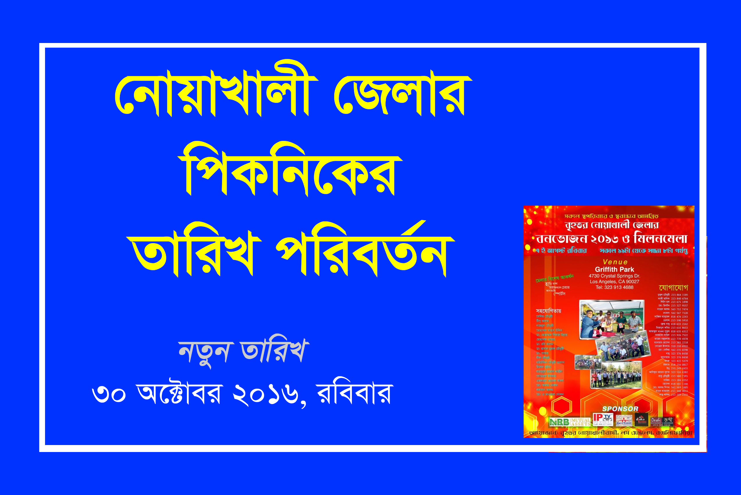 লস এঞ্জেলেসে বৃহত্তর নোয়াখালী জেলার বার্ষিক পিকনিক ও মিলনমেলার তারিখ পরিবর্তন করা হয়েছে। ০৭ আগস্টের পরিবর্তে আগামী ৩০ অক্টোবর রবিবার গ্রিফিথ পার্কে এই প্রোগ্রাম অনুষ্ঠিত হবে।