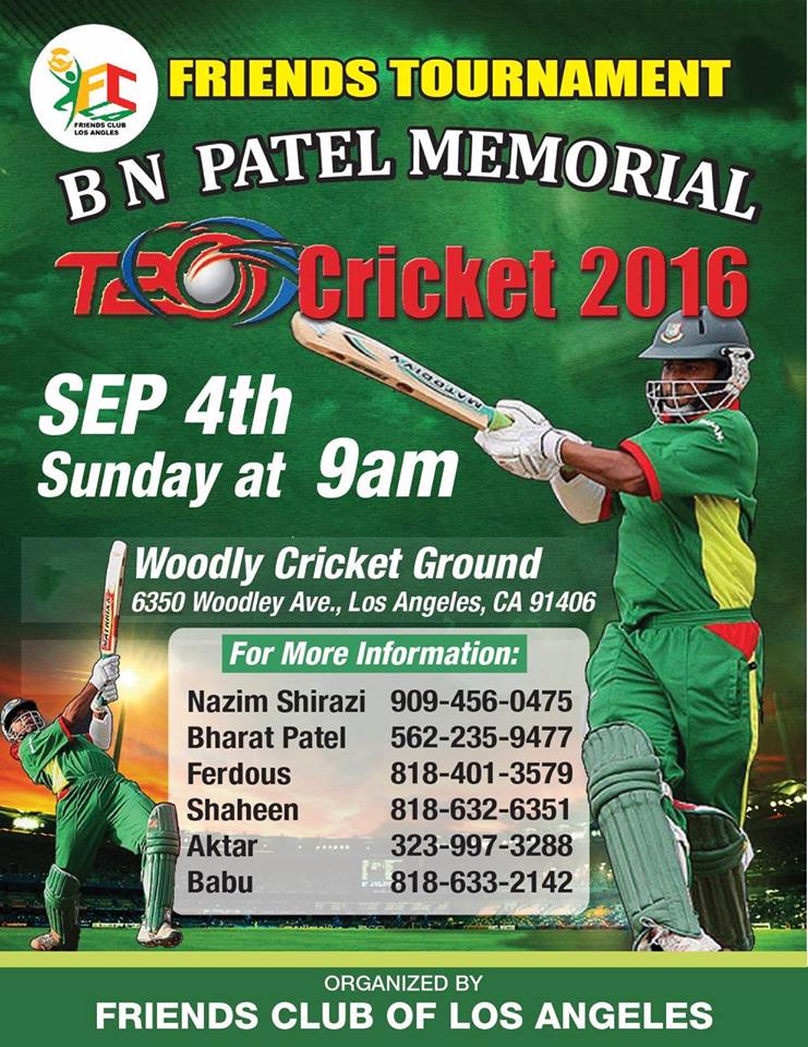 প্রবাসে বাংলাদেশি ক্রীড়া ও সংস্কৃতি ছড়িয়ে দেয়ার প্রত্যয়দ্বীপ্ত সংগঠন ‘ফ্রেন্ডস ক্লাব অব লস এঞ্জেলেস’ বিভিন্ন সময় বিভিন্ন ধরণের খেলাধুলার আয়োজন করে আসছে প্রতিষ্ঠালগ্ন থেকে।এরই ধারাবহিকতায় আগামী ৪টা সেপ্টেম্বর লেবার ডে উইক এন্ড-এ ৩য় বারের মতো লস এঞ্জেলেসে এক টি টুয়েন্টি ক্রিকেট টুর্নামেন্ট আয়োজন করেছ সংগঠনটি। টুর্নামেন্টটির স্পন্সর হচ্ছেন বিএন প্যাটেল।