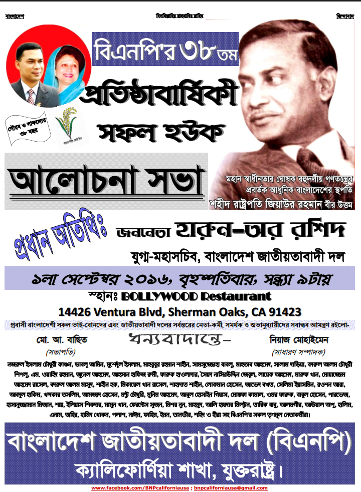আগামী ১লা সেপ্টেম্বর বাংলাদেশ জাতীয়তাবাদী দলের (বিএনপি) ৩৮তম প্রতিষ্ঠাবার্ষিকী। এ উপলক্ষ্যে ক্যালিফোর্ণিয়া বিএনপি'র উদ্যোগে যুক্তরাষ্ট্রের মেগাসিটি লস এঞ্জেলেসে এক আলোচনা সভার আয়োজন করা হয়েছে। এতে উপস্হিত থাকবেন বিএনপি'র যুগ্ম-মহাসচিব জনাব হারুন-অর রশিদ। বাংলাদেশের উত্তরাঞ্চলের কৃতি সন্তান জনাব হারুন-অর রশিদ চাঁপাইনবাবগঞ্জ সদর আসনের সাবেক নির্বাচিত এমপি, রাজশাহী বিশ্ববিদ্যালয়ের তুঁখোড় ছাত্রনেতা হিসাবে ছাত্র ও গণ-আন্দোলনের বিভিন্ন সংকটকালে সামনে থেকে ভূমিকা রেখেছেন ও ছাত্রদলের নেতৃত্ব দিয়েছেন, এছাড়া বিএনপি'র রাজশাহী বিভাগীয় সাংগঠনিক সম্পাদকের দায়িত্ব পালন করেছেন।
