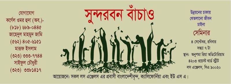 পৃথিবীর অন্যতম সপ্তাশ্চর্য ও ম্যানগ্রোভ ফরেস্ট, বাংলাদেশের সুন্দরবন এলাকায় বিদ্যুৎকেন্দ্র নির্মাণ সিদ্ধান্তের প্রতিবাদে লস এঞ্জেলেসে এক সেমিনার আয়োজন করা হয়েছে। প্রবাসী বাংলাদেশীদের উদ্যোগে ‘সুন্দরবন বাঁচাও’ শীর্ষক এই সেমিনার আগামী ৪ সেপ্টেম্বর রবিবার সন্ধ্যা ৭:০০টায় স্থানীয় অনুপমা রিয়া মিলনায়তনে (৪২০৩ ওয়েস্ট থার্ড স্ট্রীট, লস এঞ্জেলেস, সিএ ৯০০২০) অনুষ্ঠিত হবে।