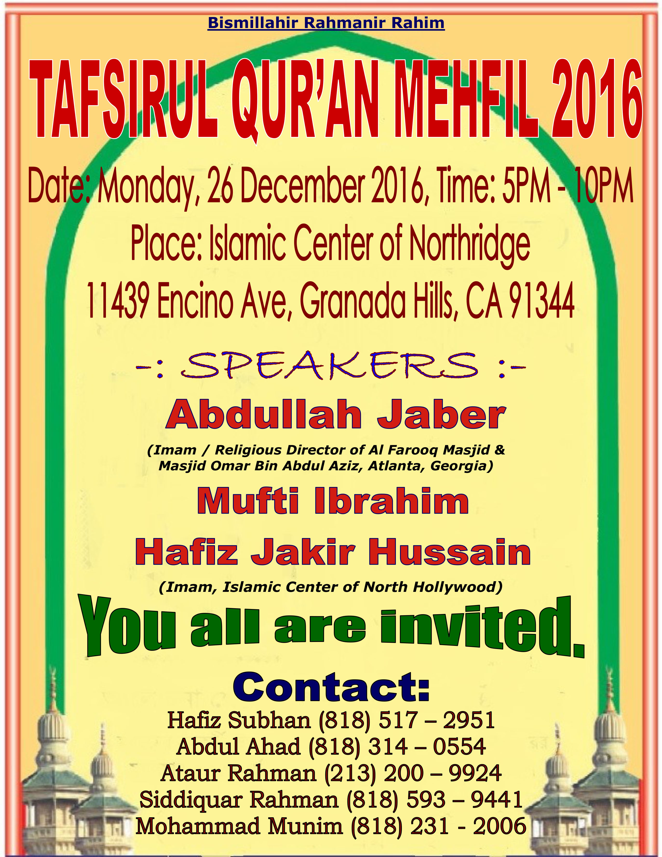 আগামী ২৬ ডিসেম্বর সোমবার ইসলামিক সেন্টার অব নর্থরিজে (11439 Encino Ave, Granada Hills, CA 91344) এক তাফসিরুল কোরআন মাহফিল অনুষ্ঠিত হবে।