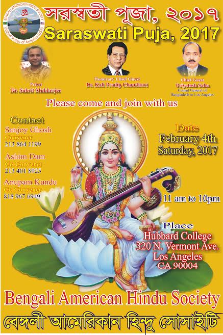 প্রতিবারের ন্যায় এবারও লস এঞেলেসে সরস্বতী পূজা উদযপান করছে বেঙ্গলী আমেরিকান হিন্দু সোসাইটি। আগামী ৪ ফেব্রুয়ারি শনিবার Hubbard College (320 N. Vermont Ave. LA, CA 90004) এ এই পূজা উদযাপিত হবে।
