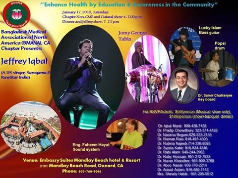 লস এঞ্জেলেসে “BANGLADESH MEDICAL ASSOCIATION OF NORTH AMERICA” বা BMANA, CA এর আয়োজিত অনুষ্ঠানে আসছেন জনপ্রিয় ভারতীয় কণ্ঠশিল্পী জেফ্রি ইকবাল । আগামী ১৭ জানুয়ারি ২০১৫ তারিখে অনুষ্ঠিতব্য আয়োজনে টাড় সহ শিল্পীগণও অংশ নিবেন । স্থানঃ Embassy Suites Mandlay Beach Hotel & Resort,2101 Mandlay Beach Road,Oxnard,CA. Phone: 005-760-9046 ।