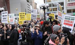 ‘বোমা ফেলে সিরিয়ার মানুষকে রক্ষা করা যায় না বরং এতে প্রাণহানি ঘটে’, ‘মানবিকতার বিচারে বলছি ফ্যাসিস্ট আমেরিকাকে আমরা মানবো না।’ ইত্যাদি নানা স্লোগান লেখা প্ল্যাকার্ড ছিল বিক্ষোভকারীদের হাতে।
