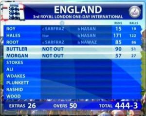 ফলে বলে দেয়া যা, ১০ বছর আগের গড়া লঙ্কানদের বিশ্বরেকর্ড ভাঙলো ইংলিশরা। অ্যালেক্স হেলসের অনবদ্য সেঞ্চুরি ছাড়াও জশ বাটলার ৯০, জো রুট ৮৫ ও অধিনায়ক ইয়ন মরগ্যান ৫৭ রান করেন।