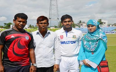 ক্রিকেটে প্রথম জীবনের কোচ আল মাহমুদ (বাঁয়ে) এবং বাবা ও বোনের সঙ্গে মেহেদী হাসান মিরাজ