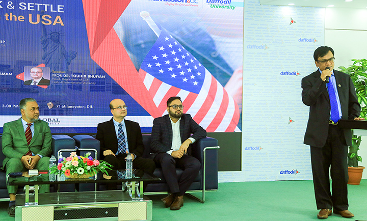 ক্যাপশনঃ ড্যাফোডিল ইন্টারন্যাশনাল ইউনিভার্সিটি ও অ্যাডমিশন ডট এসির যৌথ আয়োজনে ‘যুুক্তরাষ্ট্রে উচ্চশিক্ষা, কর্মসংস্থান ও আবাসন’ শীর্ষক সেমিনারে প্রধান আলোচক হিসেবে বক্তব্য রাখছেন যুক্তরাষ্ট্রের আইগ্লোবাল ইউনিভার্সিটির আচার্য প্রকৌশলী আবুবকর হানিপ। পাশে রয়েছেন ড্যাফোডিল ফ্যামিলির প্রধান নির্বাহী কর্মকর্তা মোহাম্মদ নূরুজ্জামান এবং ড্যাফোডিল ইন্টারন্যাশনাল ইউনিভার্সির্টির কম্পিউটার সায়েন্স অ্যান্ড ইঞ্জিনিয়ারিং বিভাগের প্রধান অধ্যাপক ড. তৌহিদ ভূঁইয়া ও এডমিশন ডট এসি’র প্রধান নিবার্হী কাজী মেজবাউর রহমান মিশু।